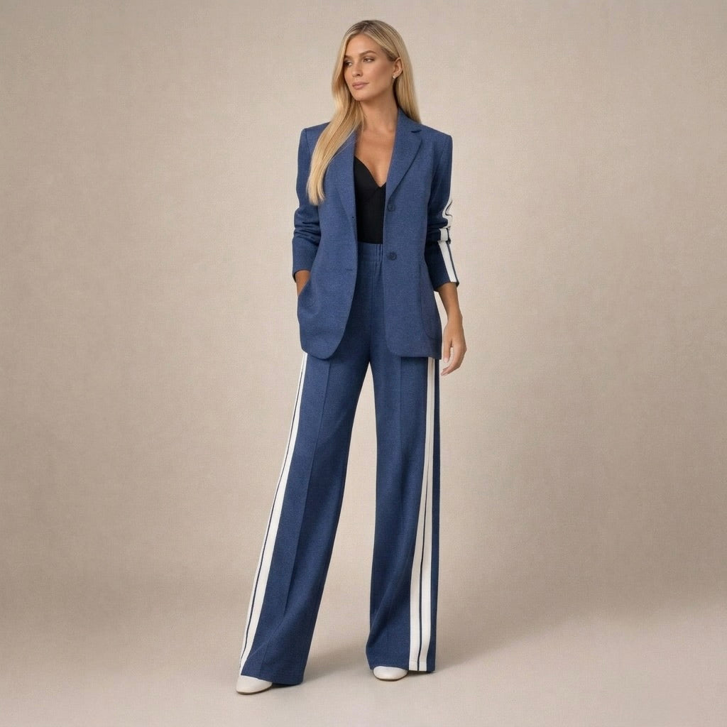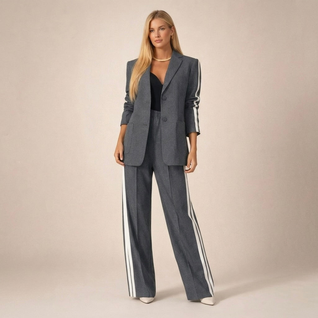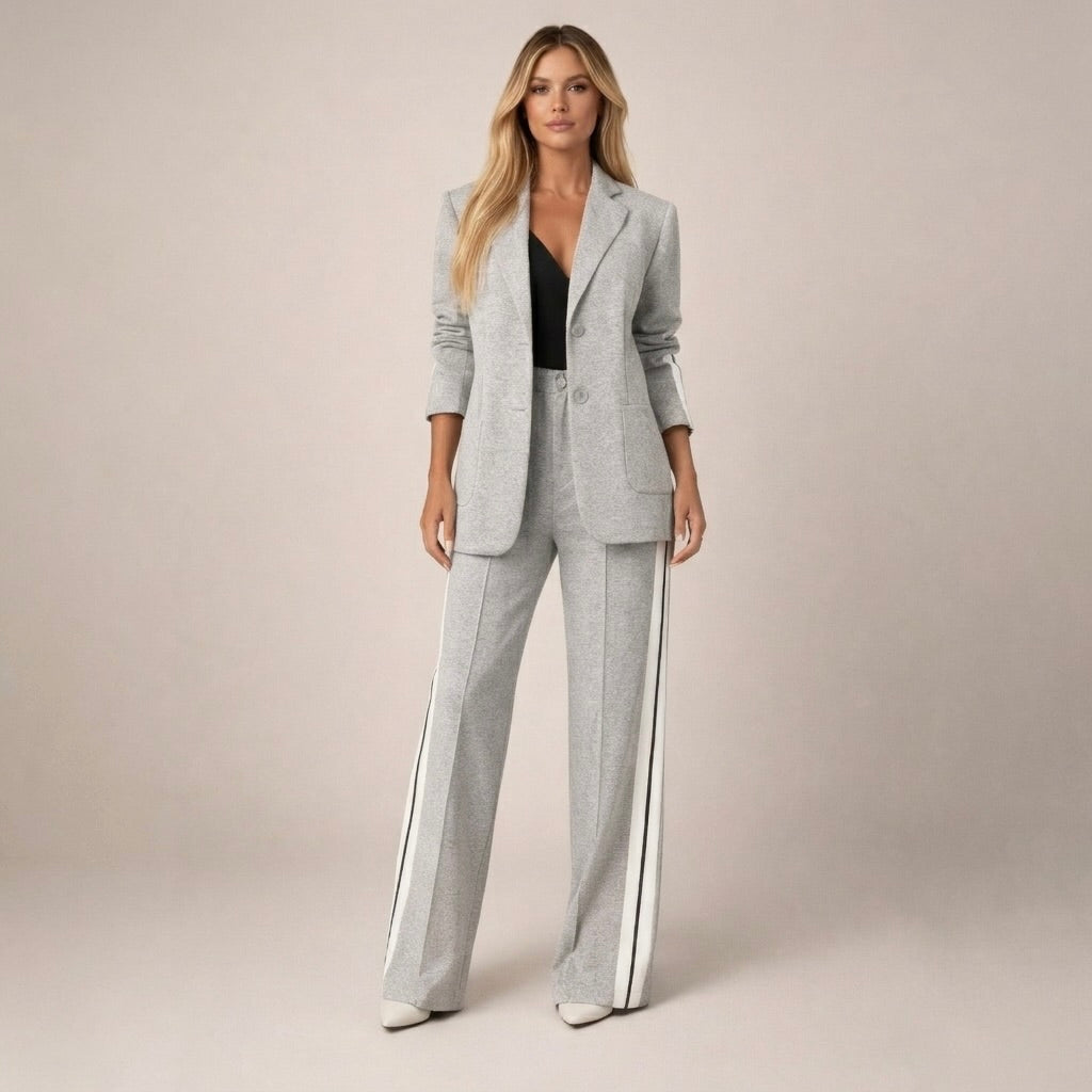 Ten elegancki komplet składa się z dopasowanej marynarki z klasycznymi klapami, pojedynczym zapięciem na guzik oraz praktycznymi kieszeniami z przodu. Spodnie mają prosty, wydłużający sylwetkę krój oraz wyraźny pasek biegnący wzdłuż nogawki. Całość tworzy harmonijny zestaw o dopracowanym kroju, który sprawdza się zarówno na co dzień, jak i podczas bardziej eleganckich okazji.