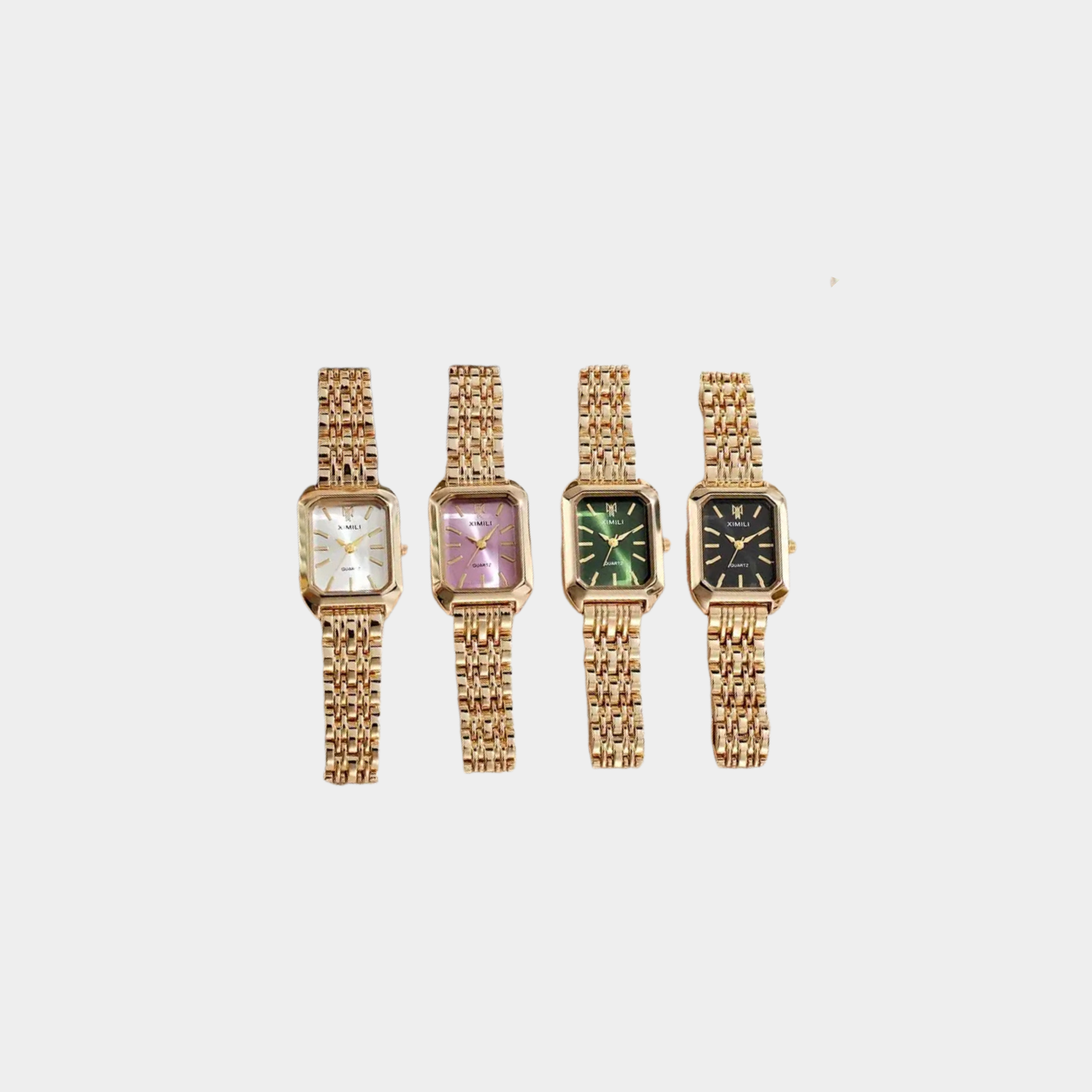 Das feine Goldarmband aus klassischen Gliedern umschließt das Handgelenk mit luxuriöser Leichtigkeit, während das geometrische Zifferblatt moderne Klarheit ausstrahlt. Eine Uhr, die jedes Outfit veredelt – minimalistisch, feminin und raffiniert.